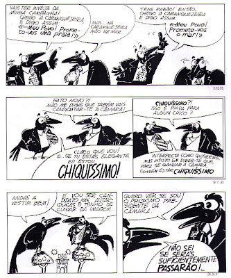 Nota: A imagem que ilustra este "post", composta por três tiras de banda desenhada (com sequencialidade, e usando os característicos balões de fala da BD), mas sob o espírito do cartune (as ferroadas políticas, datadas e apenas compreensíveis para uma determinada área de leitores mais a par dos acontecimentos), pertence à obra Os olhos em bico, editada em álbum formato italiano, ao baixo, em 1997.