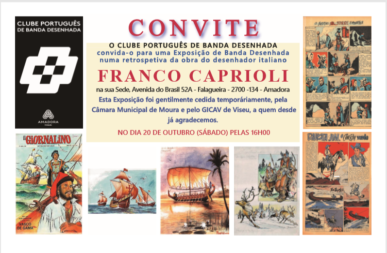 Caprioli, autor italiano de nomeada, com número assinalável de bandas desenhadas publicadas em Portugal - nas revistas Cavaleiro Andante, Colecção Lince, Jornal da BD, Jornal do Cuto, Mundo de Aventuras, em álbuns, e nos fanzines Franco Caprioli - no Centenário do Desenhador Poeta e Fandaventuras - vai ter direito a exposição na sede do Clube Português de Banda Desenhada.