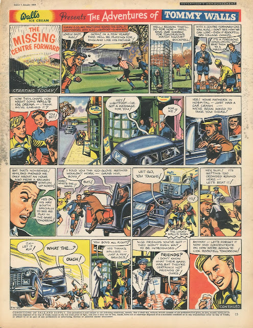 Publicidade na banda desenhada aparecia na revista inglesa Eagle, como se pode observar na prancha inicial de The Missing Centre Forward, uma história centrada no tema futebol, e a falta que faz um bom ponta de lança - ou avançado-centro, como se dizia antigamente, adaptando a forma inglesa, usada pelos inventores do football...