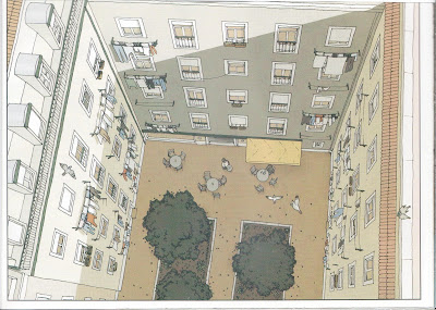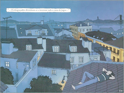 2) Na imaginação com que planifica, por vezes, a prancha (observe-se a primeira bd desta postagem, intitulada "Sumário: Carnaval"), e na coragem de se atirar à sua concretização, neste caso duas pranchas totalmente vistas pelo desenhador-artista, e pelo leitor-visionador, de um plano superior, em arrojado e exigente plano picado.