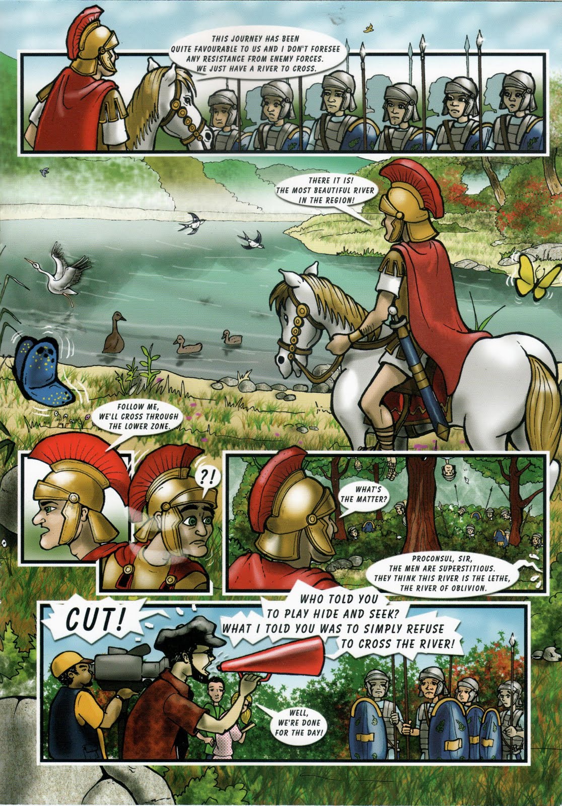 Assim fala aos seus soldados o procônsul romano (bom, falaria antes em latim bárbaro, mas o álbum destina-se a alunos do ensino básico), quando se lhe depara o rio Lima.